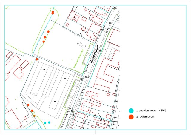 Om de bouw van 57 grondgebonden woningen in deelgebied Centrum-West mogelijk te maken, moeten er bomen worden gekapt. We hebben ons best gedaan om de woningen zo goed mogelijk in te passen waardoor er maar negen bomen worden gekapt. Hiervoor is een kapvergunning aangevraagd. Het gaat om bomen die niet op de lijst van waardevolle bomen staan. Daarnaast worden twee waardevolle bomen gesnoeid. Op de afbeelding hieronder is te zien welke bomen worden gekapt en welke bomen worden gesnoeid. Er worden ook drie bomen herplant.
